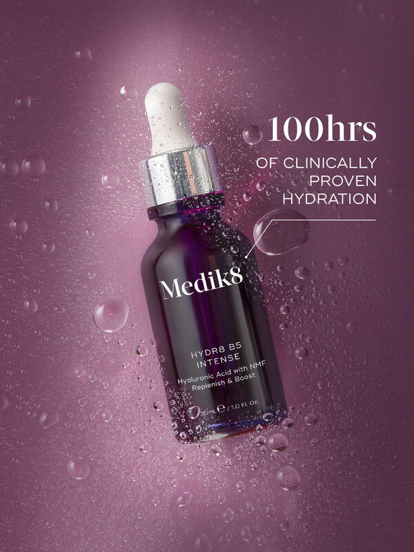 Hydr8 B5 Intense, som är Medik8 mest avancerade hyaluronsyreserum, innehåller en blandning av hyaluronsyra i olika molekylvikter, kraftfulla superfoods-antioxidanter och naturliga fuktgivande faktorer (NMFs).